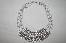 3. Thread the needle at one end of battens, interleaves the ribbon in the first ring on the underside of the necklace.